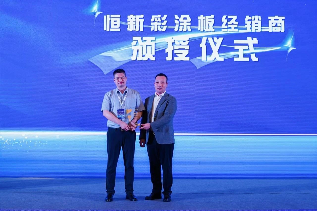 在恒新彩涂板经销商授权仪式上,kaiyun兆建公司总经理陈铁柱先生向联合举办方佛山市常松钢材贸易有限公司总经理戴清洪先生颁发了授权牌,并同与会嘉宾上台合影留念,在现场嘉宾的共同见证下开启深度友好合作新篇章!