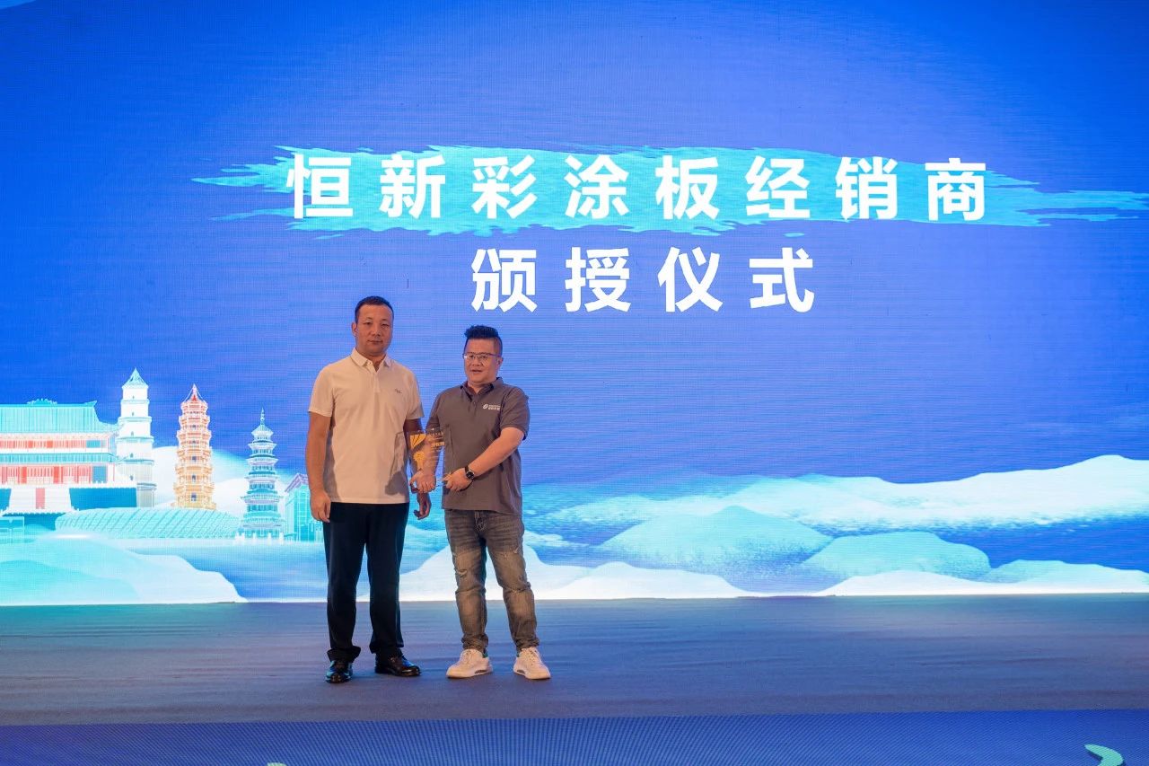 在现场嘉宾的共同见证下,恒新彩涂板经销商颁授仪式顺利进行。kaiyun企业总经理陈铁柱陈总为福建鑫富鸿钢铁贸易有限公司总经理蔡锦尚颁发授权牌,进一步巩固了与经销商之间的合作关系。恒新品牌将继续致力于提供高质量的产品和更优质的服务,与客户共同成长,共同绘就美好蓝图!